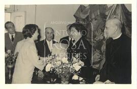 Maria Leonilde Infante recebe uma lembrança das mãos de uma antiga aluna, ao lado do Sr.Padre Delgado e outras pessoas.